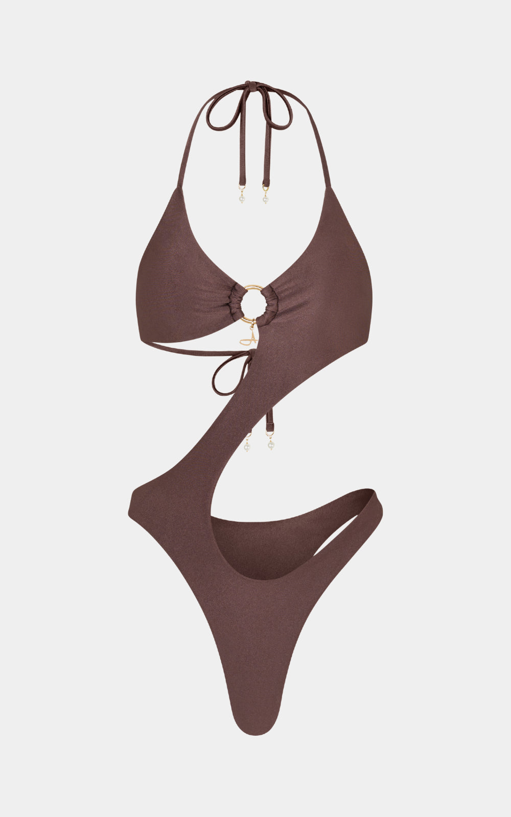 The Sole bodysuit in espresso is one-Piece swimsuit featuring gold rings at front and our signature mother of pearl charms at the back. Complete the look with our Luna Skirt to take your swimwear from day to night.