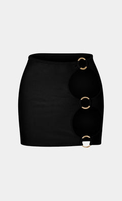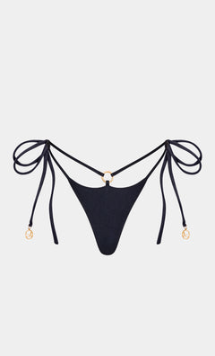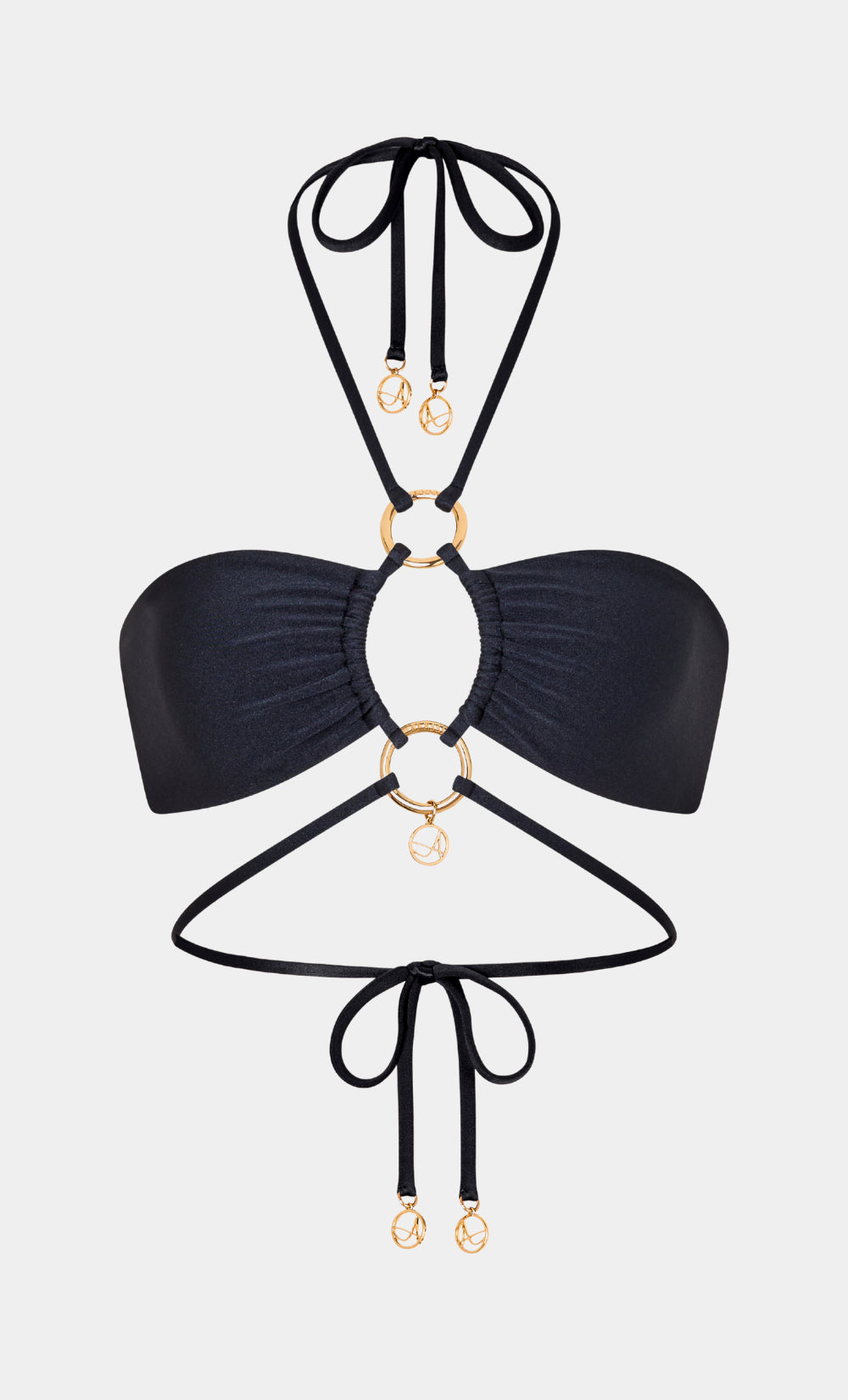 The Matilda top in black, made from premium Italian fabrics, features bandeau cups with ruched details and refined thin straps that tie around the neck and under the bust, creating a sophisticated cut-out effect. At the centre, two gold signature Alessi rings serve as a focal point, adding a distinctive and luxurious touch. The straps, adorned with characteristic Alessi pendants, tie at the back, offering adjustable support and a sensual look. Perfect for those seeking an elegant and fashionable beach look.