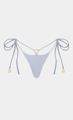 The Matilda top features bandeau cups with ruched details and refined thin straps that tie around the neck and under the bust, creating a sophisticated cut-out effect. At the centre, two gold signature Alessi rings serve as a focal point, adding a distinctive and luxurious touch. The straps, adorned with characteristic Alessi pendants, tie at the back, offering adjustable support and a sensual look. Perfect for those seeking an elegant and fashionable beach look.