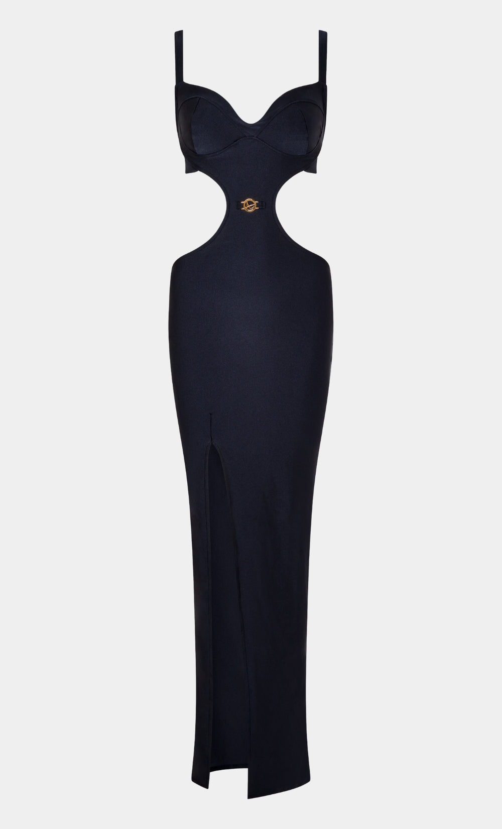 The Mia Dress is the definition of timeless glamour, designed to make a statement wherever you go. Crafted from our signature iItalian Lycra, it drapes beautifully over the body, hugging your curves in all the right places. The bustier-style top enhances the silhouette, while the cut-out waist detail and gold-plated charm add a touch of luxury. With its thigh-high slit, this dress is both sophisticated and sultry, perfect for any occasion—from a sunset dinner to a night out. Whether paired with sandals for a beachside look or heels for an elevated evening vibe, the Mia Dress is your go-to for effortless chic.